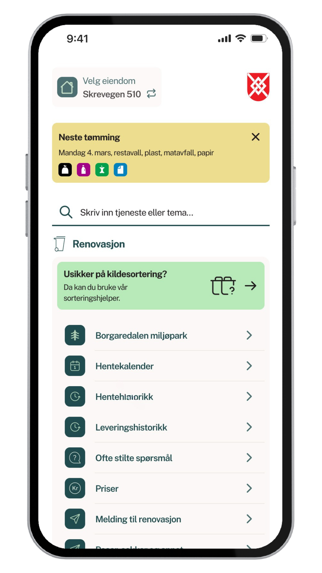 Med trygg innlogging via BankID kobles appen til tjenestene du har hos kommunen, for eksempel hentekalender for din eiendom, QR-kode som inngangsbevis i miljøparken, oversikt over fakturaer og mye mer.