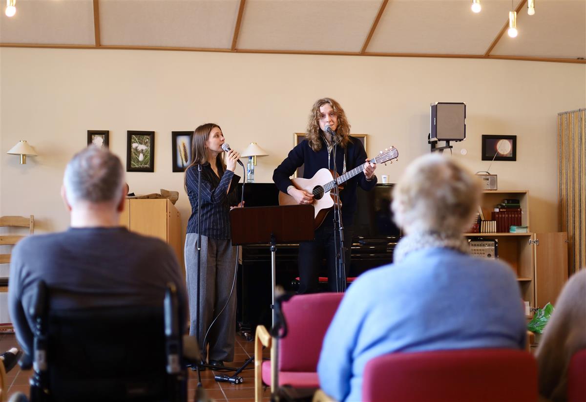 Musikkduoen Torstein Kvamme Holum og Dorothea Økland holder konsert for beboere og ansatte på Åkra sykehjem. Konsertene er en del av kommunens arbeid med musikk i eldreomsorgen.Beboerne sitter samlet i fellesstuen ved Åkra sykehjem når konserten starter. Noen nikker i takt. Andre synger stille med eller følger musikerne med blikket. Ansatte sitter sammen med dem og deler opplevelsen.