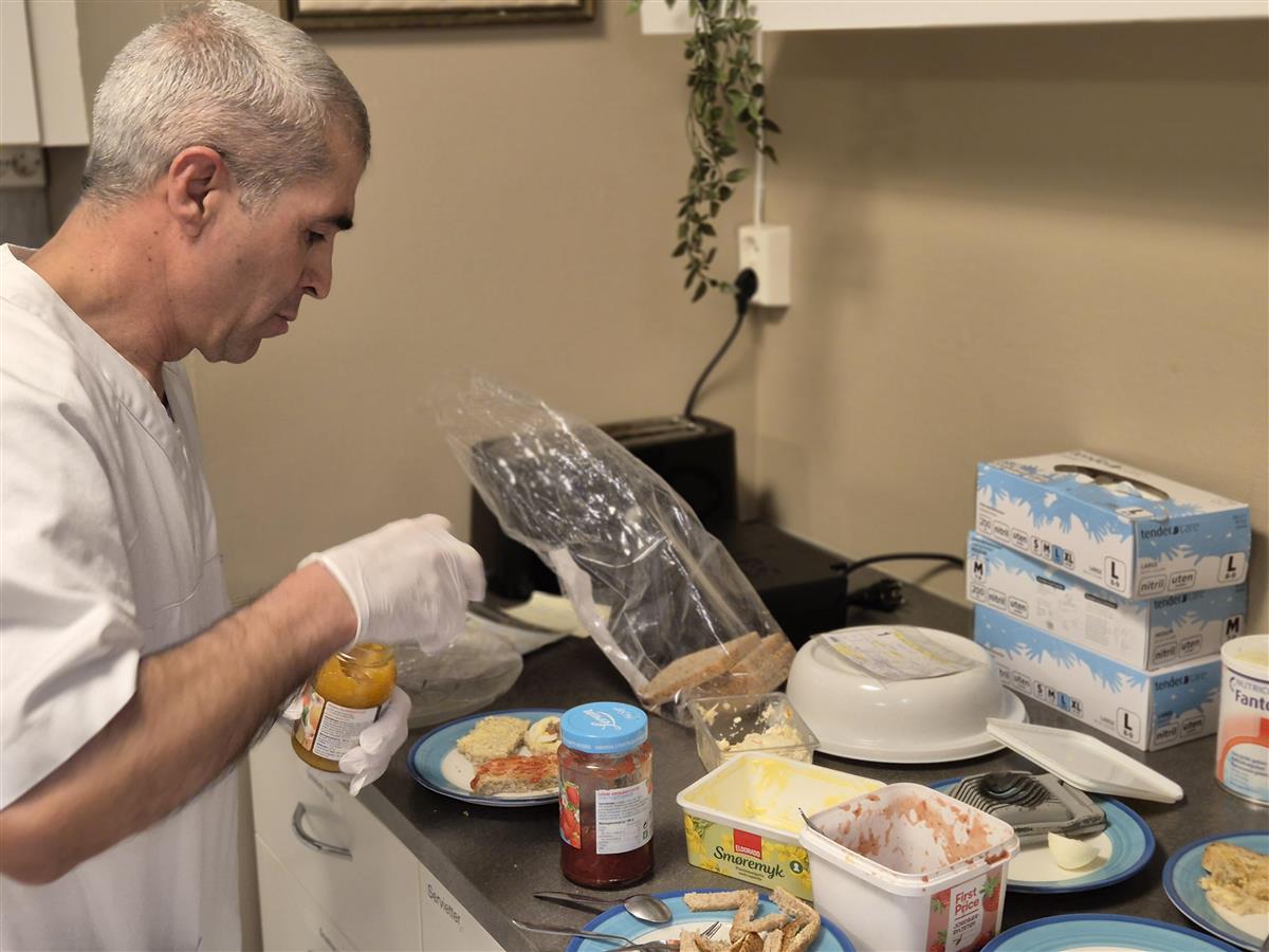 Kamiran gjør klar til frokost på kjøkkenet ved Storesund sykehjem. Gjennom Inkluderingsbilletten får han språk- og arbeidstrening midt i hverdagen sammen med kolleger og beboere.