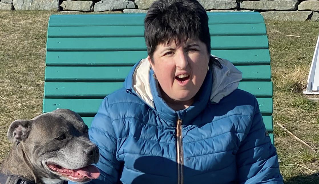 Romina sitter på en grønn stol blant TiO-stolene, sammen med hunden Charlie, og nyter et rolig øyeblikk fylt med fellesskap og livsglede.