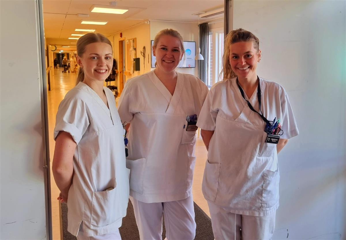 Sykepleierne Karianne Kristoffersen Ferkingstad, Cecilie Bjerk og Solveig Marie Klæhaug Baardsen er klare for å veilede nye kolleger ved Åkra sykehjem.