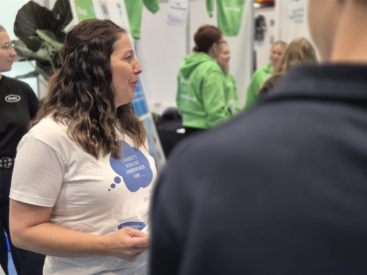 Barnehageleder Maria Nordstrand (Karmøy) forteller ungdommer om mulighetene for jobb og fagbrev som barne- og ungdomsarbeider under Yrkesmessa 2025.