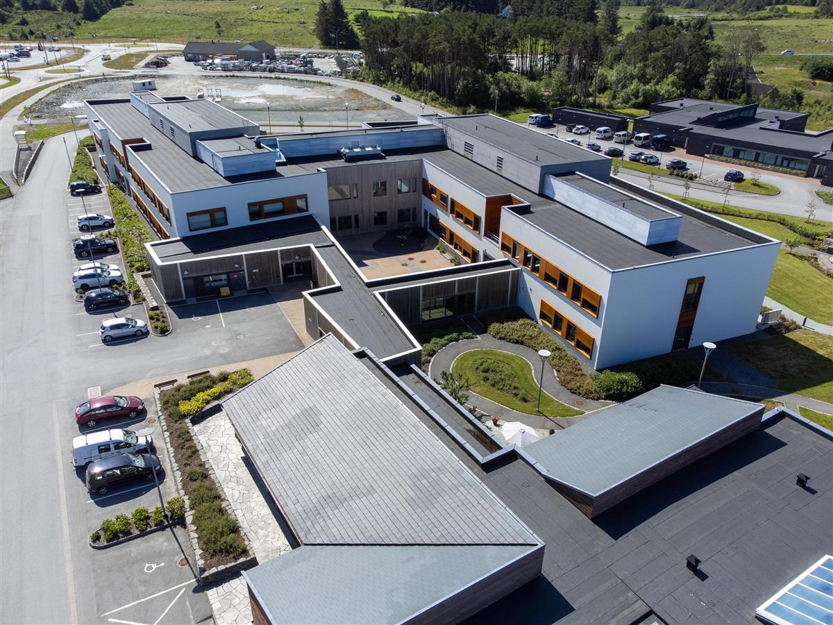 Vea sykehjem sett ovenfra – et moderne omsorgssenter med lyse fasiliteter og rom for trivsel.