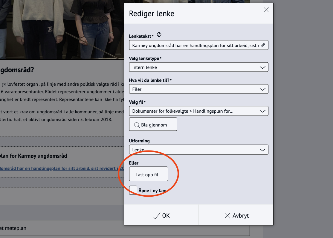 Skal du oppdatere en fil, er det bare å redigere lenke, og bruke Last opp fil. Da oppdaterer du filen på raskest måte.