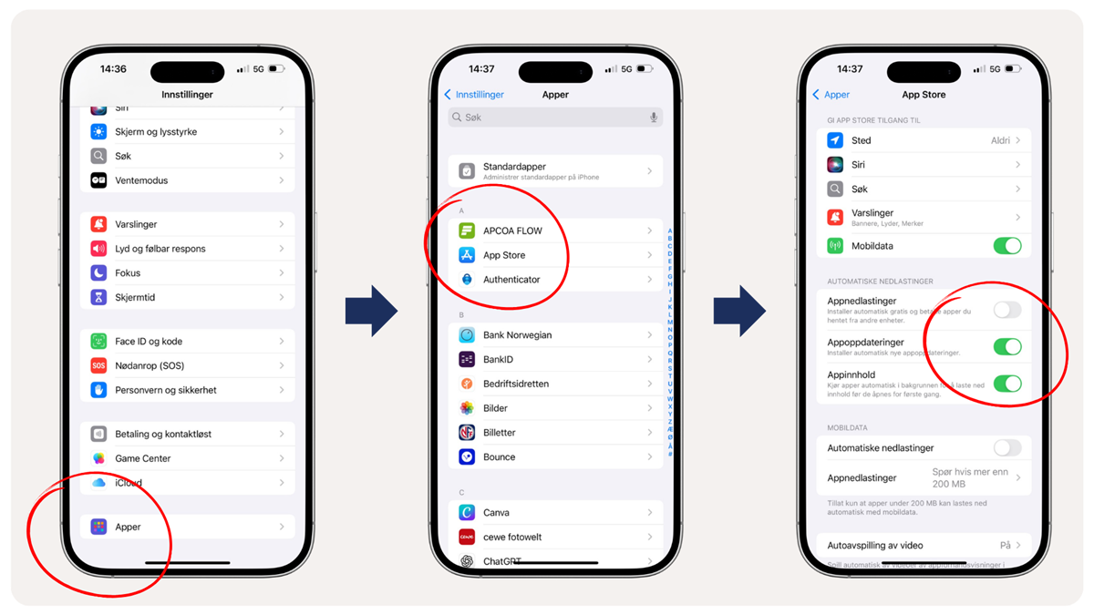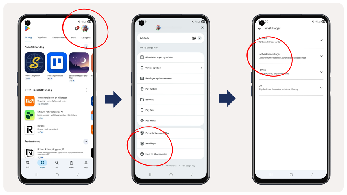 Automatisk oppdatering av appen Karmøy kommuneFor en enklere og mer stabil appopplevelse anbefaler vi å slå på automatiske oppdateringer. Innstillinger for iPhone-telefoner (Apple)Åpne innstillinger Trykk på Apper og velg App store Skru på AppoppdateringerInnstillinger for Android-telefoner (Samsung, Google osv.)Åpne appen Play ButikkTrykk på profilbilde-knappen øverst til høyreTrykk på innstillinger og velg nettverksinnstillinger og oppdater apper automatisk Publisert 30.03.2026 10:27 Sist endret 30.03.2026 10:44