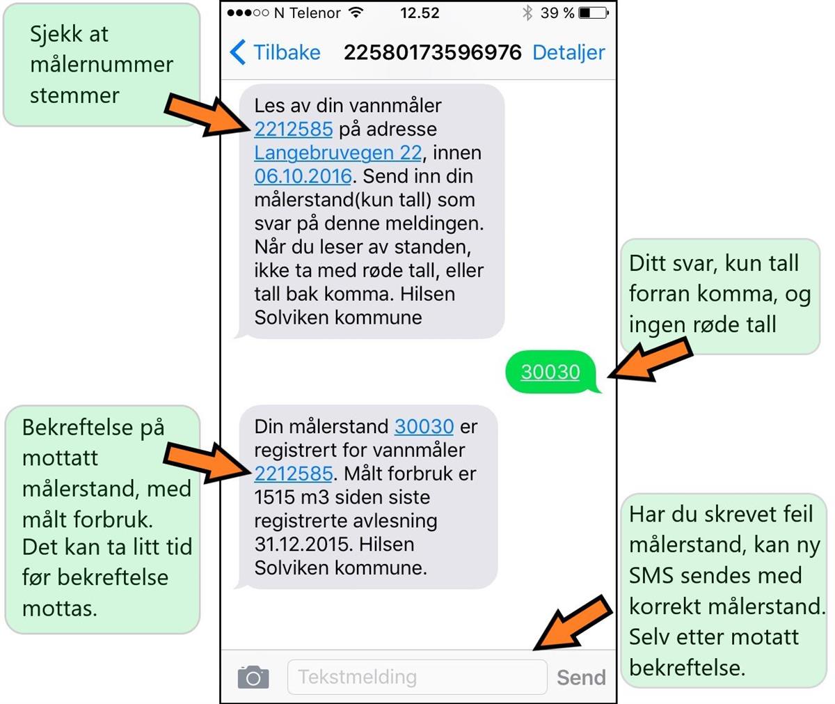 OBS: Eldre målere er registrert i kommunens system med kun de siste sifrene som står på måleren, og vil derfor avvike fra målernummer i SMS, dette er normalt. Stemmer ikke de siste sifrene? Meld fra til avgiftskontoret. - Les av vannmåleren og send inn målerstanden som svar på tilsendt SMS.