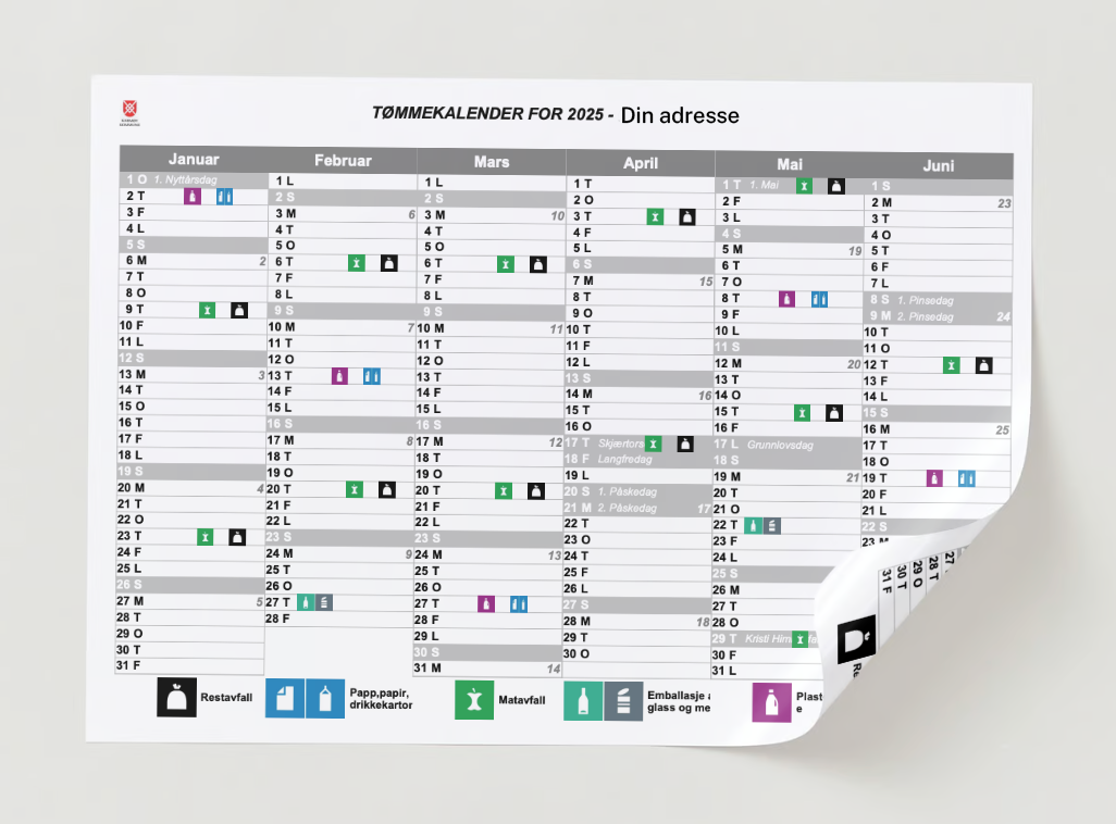 - På denne siden kan du søke opp adressen din, og trykke på “Se tømmedager for hele året”. Da vil du få opp en tømmekalender for din adresse som du kan laste ned og skrive ut.